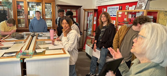 Museum volunteers Vel Gray and Claudia Soucek visited with MHS history students who toured the museum in April. They helped students with a scavenger hunt designed around the World War II exhibit including Middlesex veterans and their personal stories. The students heard a first-hand family account of Soucek’s uncle’s story of being shot down over France 4 days after D-Day.