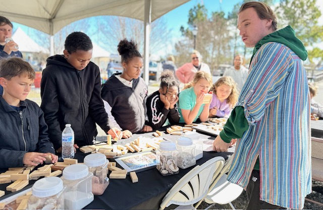 Volunteer Andrew Horton dressed as a colonial seaman to attend Education Day at the annual Urbana Oyster Festival in November working with elementary and middle school students. He guided and expanded their understanding of colonial craftsmen from our area making bricks. Working with grinding oysters and mixing them together with our local clay, water and sand the students replicated building materials that were used to construct colonial buildings that still stand in Middlesex County today.